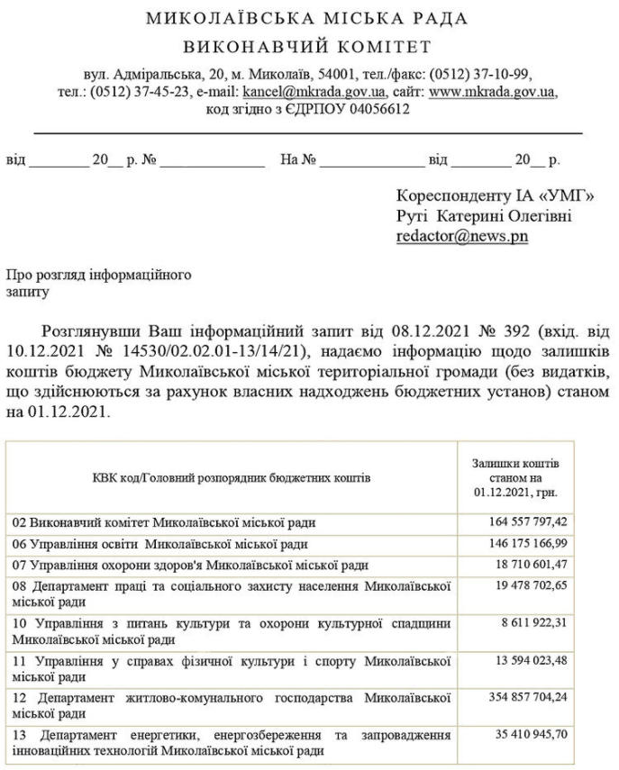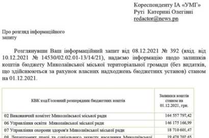 По состоянию на 1 декабря распорядители бюджетных средств Николаевского городского совета не смогли использовать 918 миллионов 514 тысяч 330 гривен или составляет 20% от всего бюджета города на 2021 год, о чём говорится в ответе на информационный запрос журналистки «Преступности.НЕТ».
