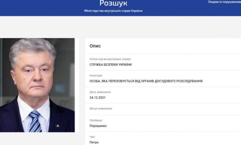 Позже ссылка на анкету Петра Порошенко на сайте МВД стала неактивна. При этом буквально несколько часов назад сообщалось, что политик включен в базу граждан МВД, которые находятся во внутригосударственном розыске. Он находился в разделе «Лица, которые скрываются от досудебного следствия». Датой «исчезновения» указано 24 декабря 2021 года.
