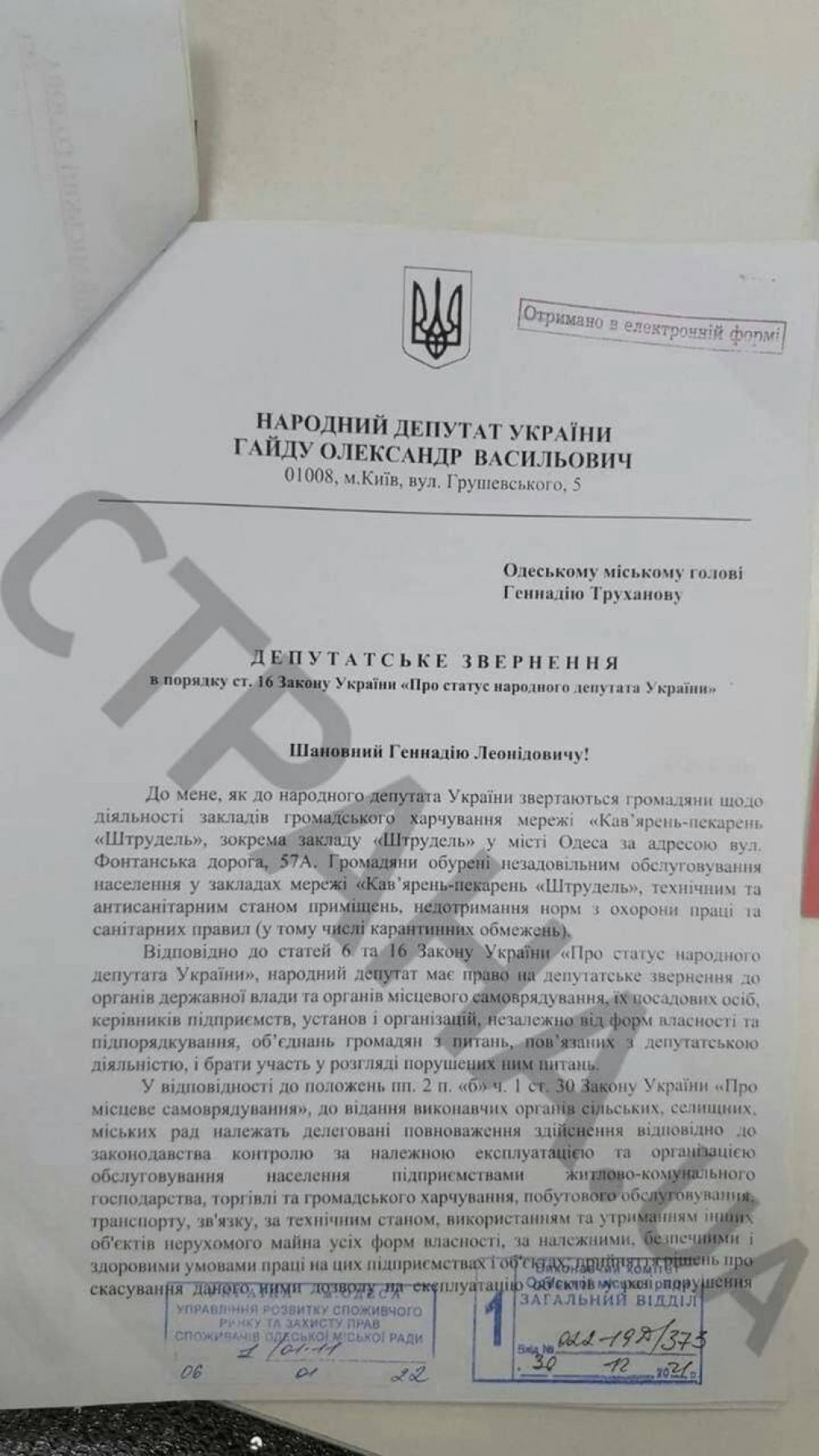 Удивительно, но в скором времени, нардеп направил обращение к одесскому городскому голове Геннадию Труханову, в котором сообщил, о том, что к нему обратились граждане с жалобами на неудовлетворительное состояние кофеен сети «Штрудель».