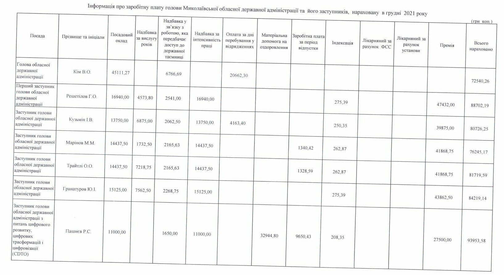 «Итак — начиная с января средняя зарплата каждого заместителя губернатора составила около 40 тыс. грн. Сам глава ОГА Ким получал в среднем около 55 тыс грн. Причем к концу года его зарплата выросла до уверенных 72 — 74 тыс грн.