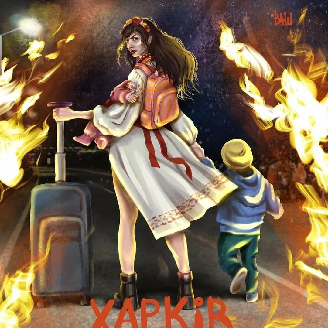 А вот Харьков, Буча и Мариуполь, которые на данный момент, пострадали от рук российских оккупантов больше всего, предстали среди мрака, крови и огня со слезами на глазах и детьми на руках. Отметим, что все героини цикла в украинских народных одеяниях.