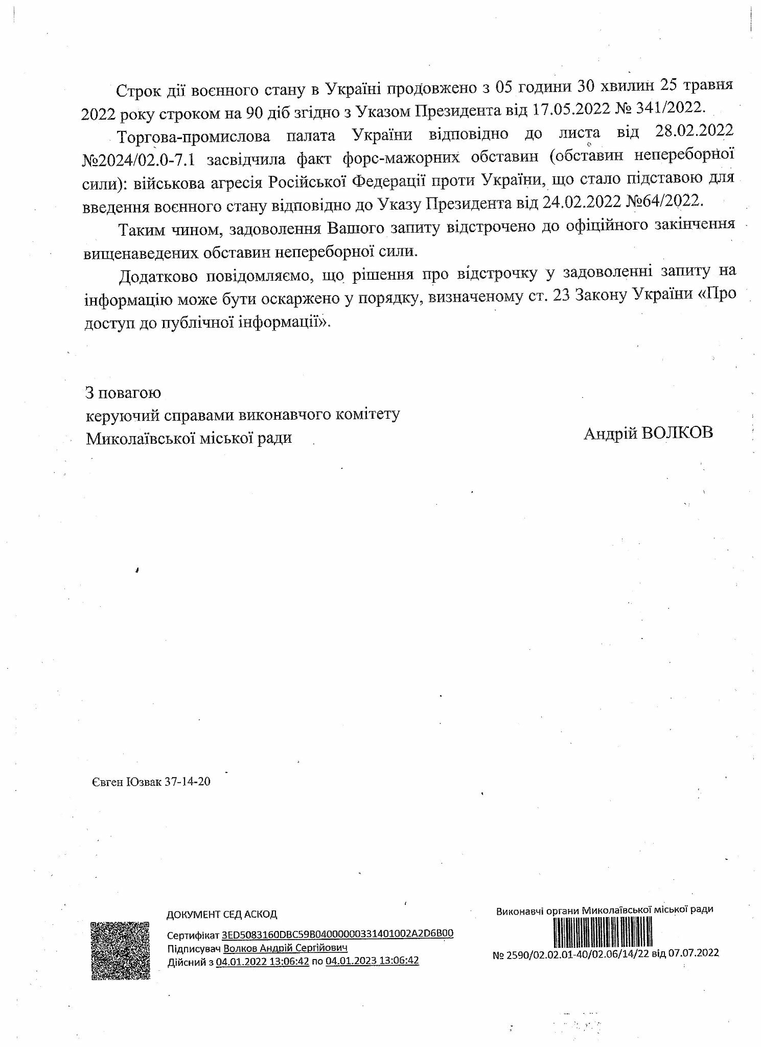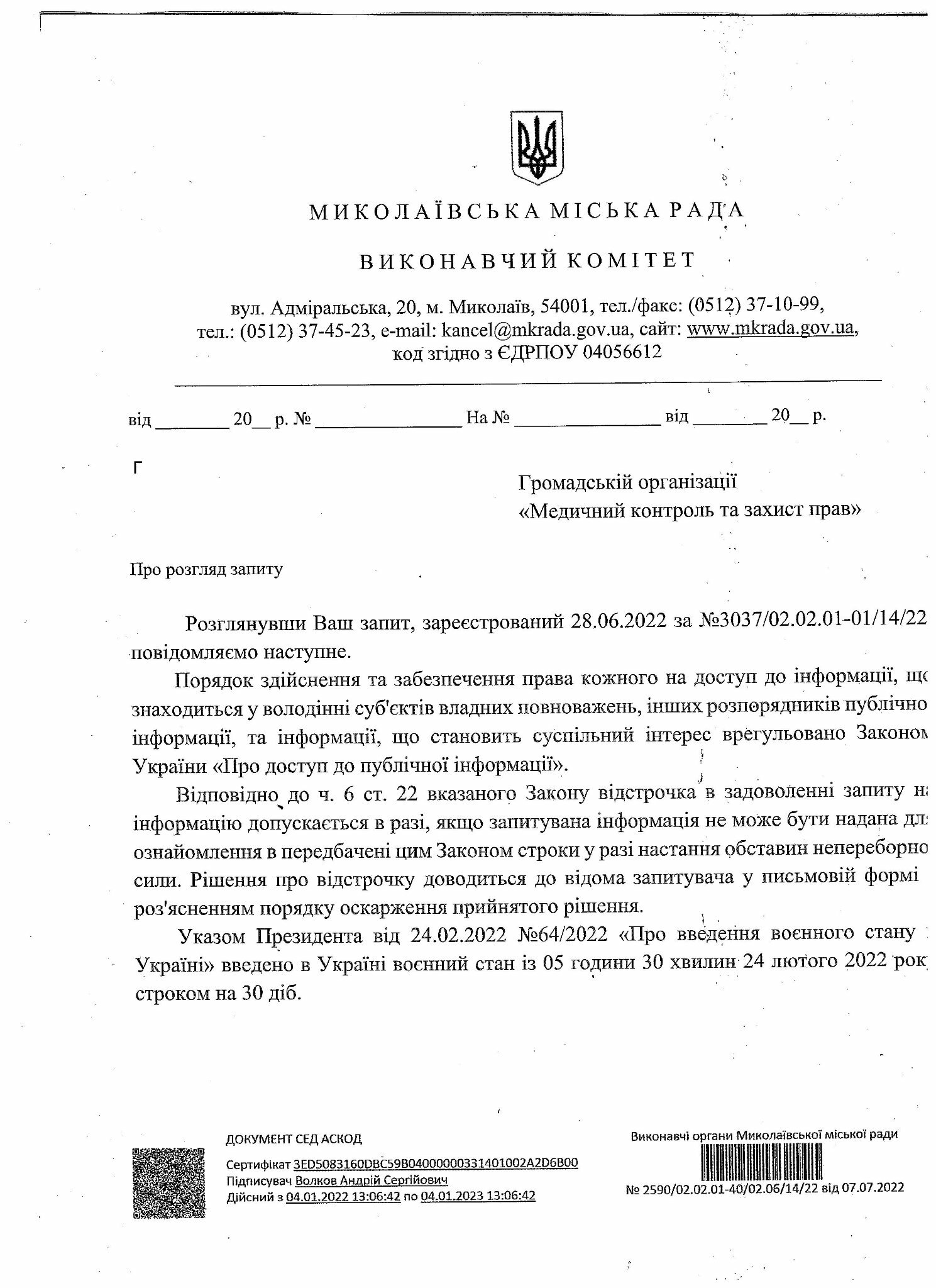 У документі, який опублікував Дмитро Рябченко, керуючий справами виконкому міськради Миколаєва Андрій Волков повідомив, що задоволення його запиту відстрочено до закінчення «обставин непереборної сили», а саме військової агресії Російської Федерації проти України.