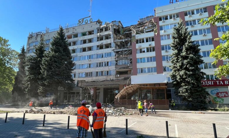 «Центр міста. Готель «Миколаїв». Ударною хвилею та уламками пошкоджена і будівля торговельно-розважального центру навпроти. На місці працюють комунальники. Вони вже розчистити проїзд від уламків та сміття для автомобілів. Наразі зачищають решту території навколо», — написал городской голова Сенкевич.