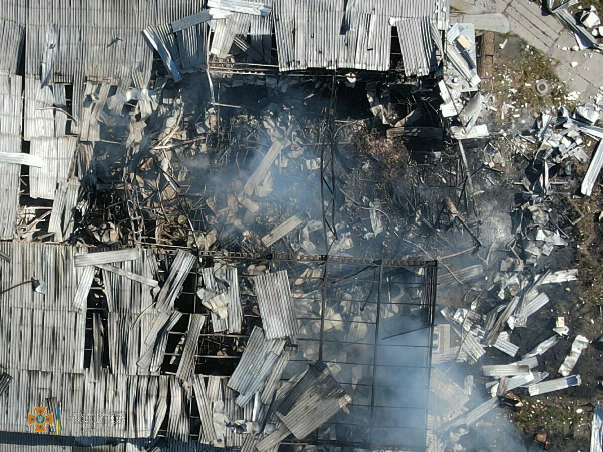 Крім того, Миколаївські рятувальники оприлюднили фото з місця ліквідації сьогоднішньої пожежі внаслідок ракетного обстрілу на об’єкті площею 1500 кв.м.