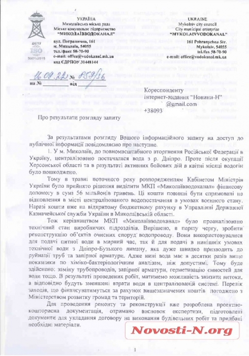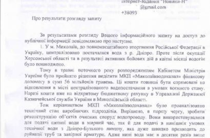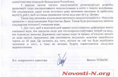 В письме, подписанном и. о. генерального директора Василием Тельписом, сообщается, что эти деньги предполагается потратить на «реконструкцию объектов очистных сооружений водопровода. Они использовались для подачи питьевой воды в мирное время и для подачи в нынешних условиях технической воды из Днепро – Бугского лимана…».