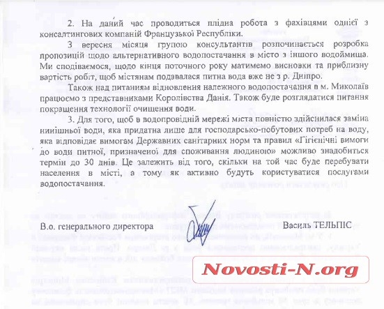 В письме также отмечается, что для замены воды, находящейся сейчас в водопроводной сети Николаева, на воду, соответствующую санитарным нормам, может понадобиться до 30 дней. Сроки замены, в свою очередь, будут зависеть от количества населения в городе и от активности пользования услугами водоснабжения.