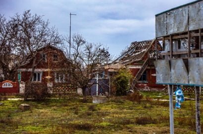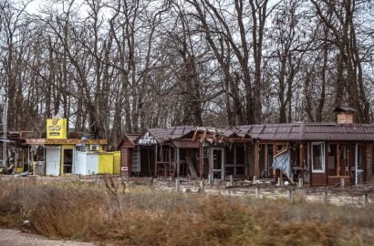 Известный всем, кто проезжал по этому пути ресторан-замок «Тамплиер» частично разрушен, здания избито осколками.
