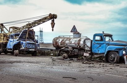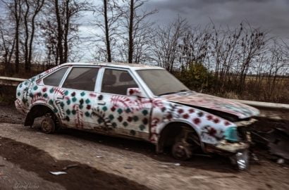 Вдоль проезжей части — сожженные автомобили, разбитые здания, «нечто», когда-то бывшее автозаправочной станцией.