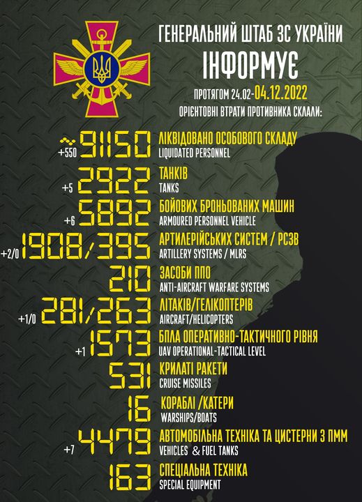 Вооруженные силы Украины с 24 февраля по 4 декабря ликвидировали около 91 150 российских захватчиков, при этом только за предыдущие сутки — 550 человек, о чём сообщает Генеральный штаб ВСУ.