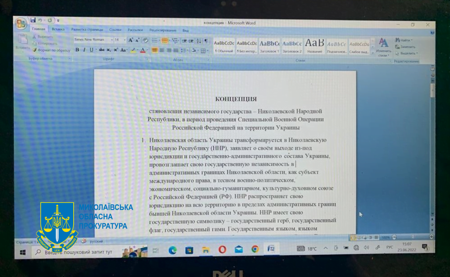 В период с мая по июнь 2022 года по заданию куратора он разработал концепцию преобразования «новой свободной Николаевской области» с учетом специфики региона и просчетов, которые имели место при создании «днр/лнр».
