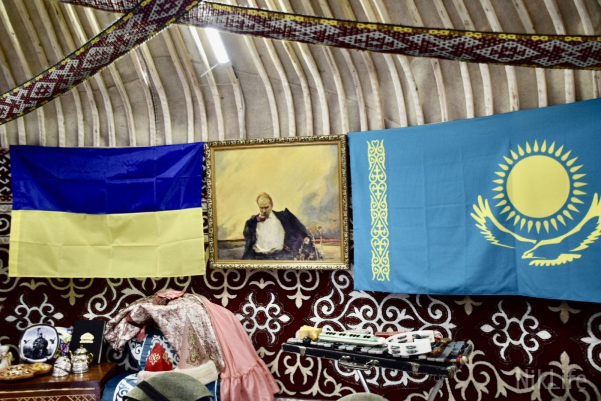 Внутри юрты можно увидеть большое количество ковров, традиционных костюмов и бытовых мелочей, характерных для региона. Кроме этого, в юрте можно найти портрет украинского писателя Тараса Шевченко, который при жизни отбывал ссылку именно в Казахстане.