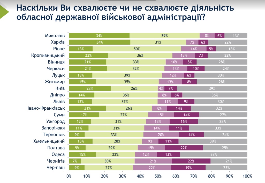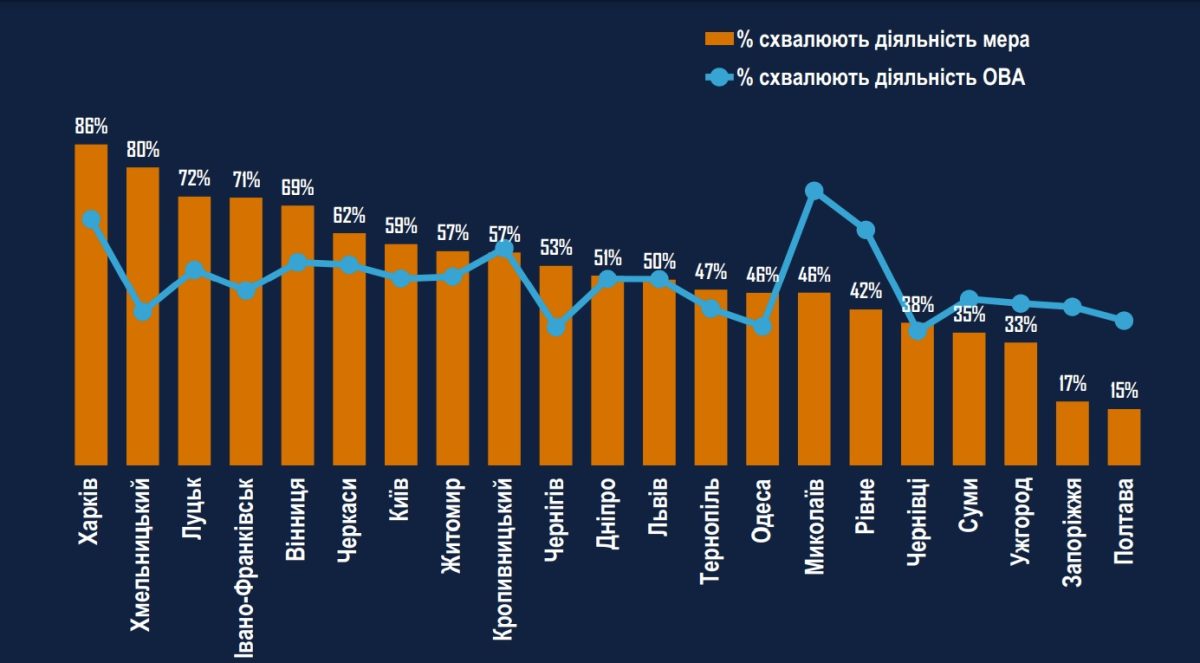 В Николаеве 34% опрошенных полностью одобряют деятельность ОВА, 39% — скорее одобряют. Не одобряют деятельность 8% опрошенных. Среди украинских городов худшая ситуация в Чернигове и Черновцах. Там всего 7 и 9 процентов горожан доверяют ОВА.