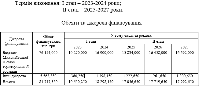 Программой предусмотрены расходы в размере 81,717 миллиона гривен в течение пяти лет. В частности, в 2023 году предусмотрено на выполнение мероприятий программы 10 миллионов 650 тысяч гривен, в 2024-м году — 18 миллионов 298 тысяч, в 2025-м — 17 миллионов 56 тысяч, в 2026-м — 17 миллионов 719 тысяч, в 2027-м — 17 миллионов 992 тысячи. Это будут как средства городского бюджета, так и другие источники финансирования.
