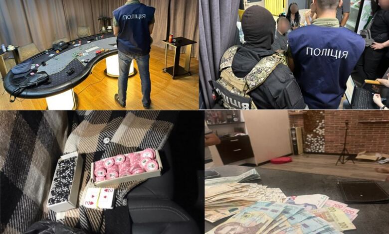В ходе расследования полиция провела обыски по адресам проведения игр и местам проживания подозреваемых. Среди изъятого — столы для покера, игровые фишки, карточные колоды, черновые записи, а также значительные суммы денег: 352 000 гривен, 3700 долларов США и 100 евро.