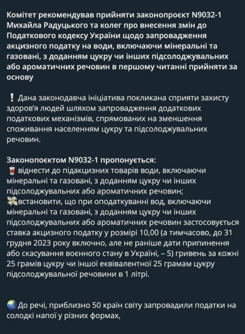 Комитет Верховной Рады Украины по вопросам финансов, налоговой и таможенной политики поддержал законопроект N9032-1 о введении акцизного налога на сладкую и газированную воду. Об этом сообщил 17 июля 2024 года в своем Telegram народный депутат Ярослав Железняк.