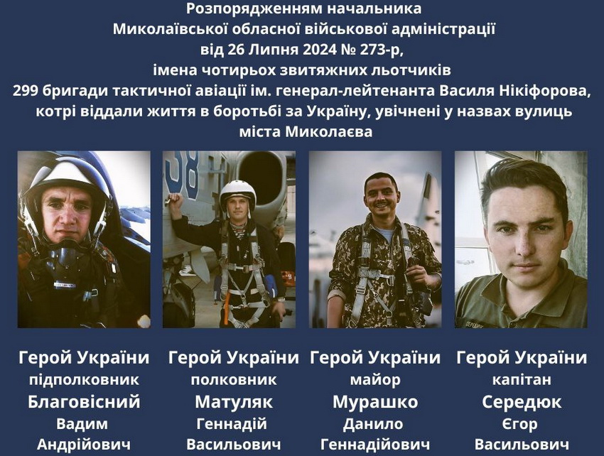 Четыре улицы Николаева теперь будут носить имена летчиков: Вадима Благовисного, Геннадия Матуляка, Даниила Мурашко и Егора Середюка. Все они — Герои Украины, награждены этим высшим званием посмертно, — сообщают Воздушные Силы Украины. Все четверо служили в 299-й бригаде тактической авиации им. генерал-лейтенанта Василия Никифорова, которая до войны базировалась в Корабельном районе нашего города (мкрн Кульбакино).
