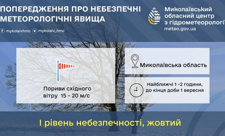 Николаевский центр гидрометеорологии предупреждает, что в ближайшие 1 — 2 часа по Николаевской области ожидается усиление восточного ветра до 15 — 20 м/с.