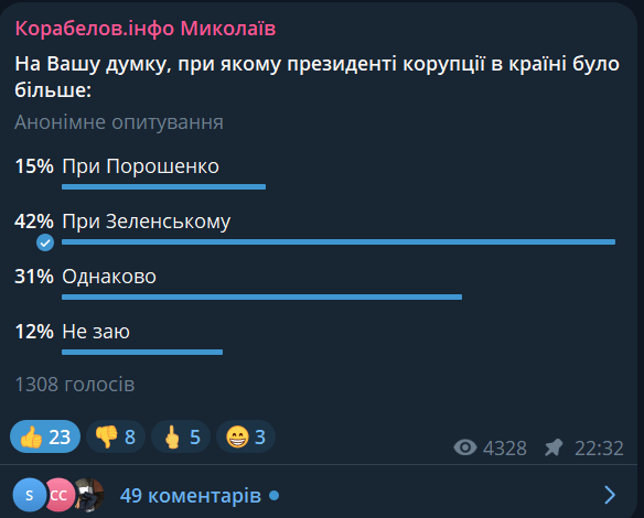 Результаты анонимного опроса среди читателей Korabelov.info вызвали оживленное обсуждение в социальных сетях. На вопрос «При каком президенте коррупции в стране было больше?» 42% респондентов ответили, что больше коррупции было именно во время правления Зеленского. Для сравнения, 15% считают, что больше злоупотреблений было при Порошенко, а 31% опрошенных считают, что уровень коррупции одинаков за обоих президентов. Только 12% респондентов заявили, что не могут дать оценку.