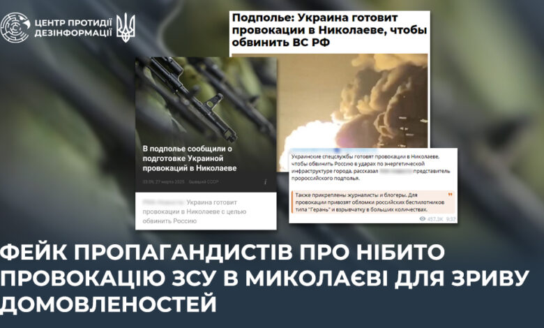 27 марта Центр противодействия дезинформации предупредил о новой информационной спецоперации, развернутой российской пропагандой. По данным ведомства, агрессор активно распространяет фейковую информацию о якобы подготовке украинскими военными «провокации» в Николаеве, чтобы сорвать договоренности по прекращению ударов по объектам энергетики.