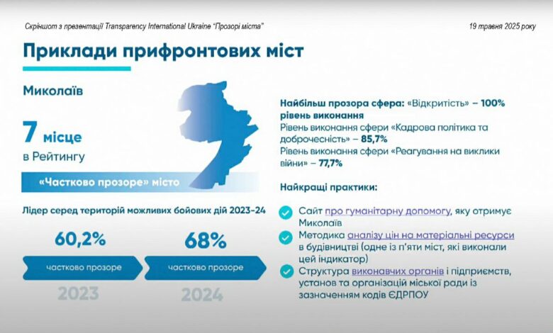 Николаев вошел в ТОП-10 самых прозрачных городов Украины, заняв 7 место в ежегодном Рейтинге прозрачности 100 крупнейших городов, опубликованном организацией Transparency International Ukraine 19 мая 2025 года. По результатам анализа город набрал 68 баллов, что соответствует статусу «частично прозрачного города». Еще в 2023 году показатель составлял 60,2%.