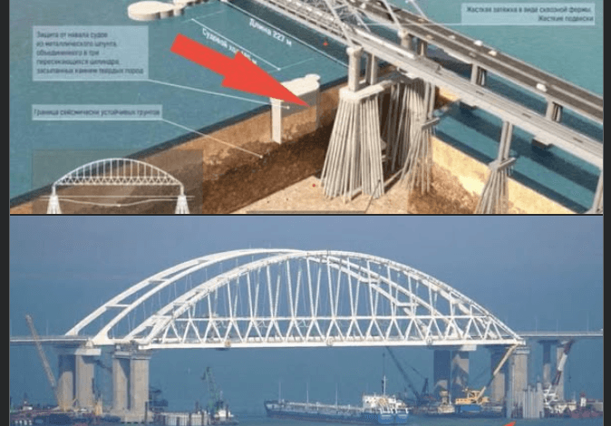 Речь идёт о ключевой опоре, которая поддерживает центральный арочный пролет — самую массивную и важную конструкцию всего моста. Именно она была определена российскими инженерами как «наиболее защищённая зона» — на схемах указана как узел с усиленным фундаментом, сваями и противоторпедной сеткой. В реальности это означает, что попасть туда — почти невозможно.