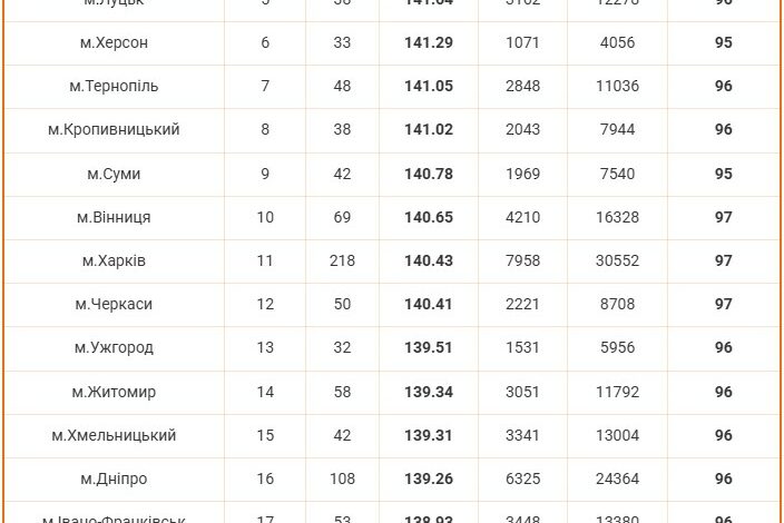 В тройке лидеров — г. Львов (145,94 балла), г. Киев (143,56 балла) и г. Ровно (142,99 балла). Для сравнения: в соседнем Херсоне средний балл составил 141,29, что позволило городу подняться на 6-е место.