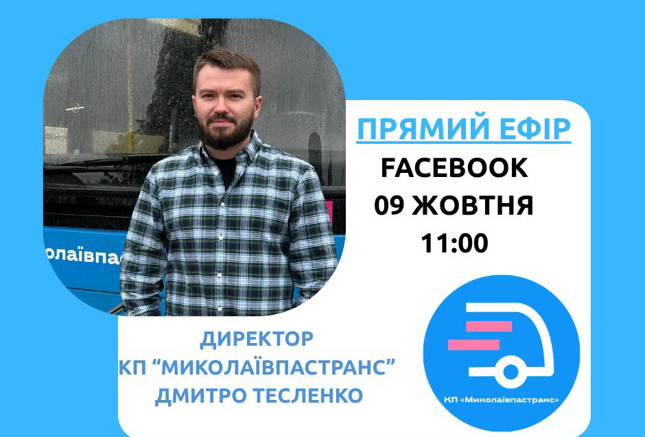 9 октября 2025 в 11:00 директор КП «Миколаївпастранс» Дмитрий Тесленко пообщается с николаевцами в формате прямого эфира на официальной странице предприятия в Facebook.
