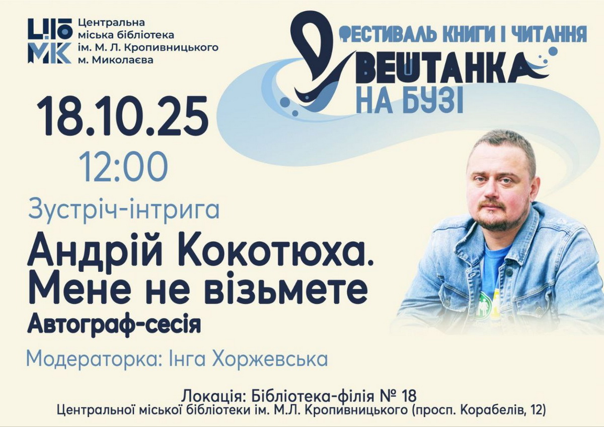 Так, в рамках указанного фестиваля библиотека-филиал №18 Центральной городской библиотеки им. М.Л. Кропивницкого (взрослая библиотека в Корабельном районе, расположенная по адресу: пр. Корабелов, 12) приглашает всех желающих на встречу-автограф с украинским писателем Андреем Кокотюхой «Меня не возьмёте».
