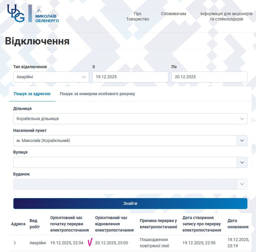 По официальной информации Николаевоблэнерго, в Корабельном районе произошло аварийное отключение из-за повреждения воздушной линии электропередач. Ориентировочное время восстановления электроснабжения — 20 декабря в 23:00, то есть примерно через сутки после атаки.