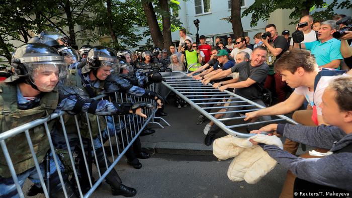 Тем временем участники митинга в Москве кричат «Фашисты» в адрес полицейских. Силовики пытаются проводить новые задержания, однако протестующие пытаются отбить их. Уровень самоорганизации среди протестующих на данный момент явно повысился. Ранее митингующие кричали «Мы без оружия».