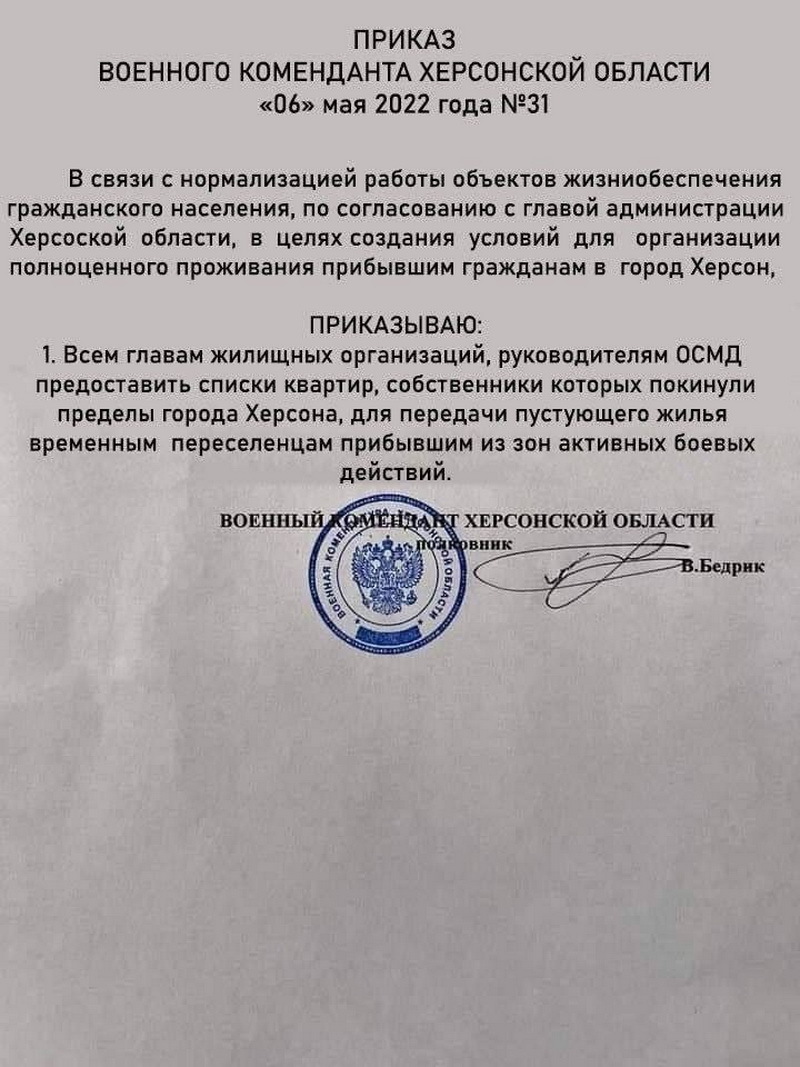 Про це свідчить «наказ» (який потрапив у мережу) «військового коменданта» Херсонської області від 6 травня 2022 року. В приказі йдеться про те, що керівники ОСББ повинні надати списки з інформацією про тих, хто не проживає у своїх помешканнях для подальшого передання квартир переселенцям.