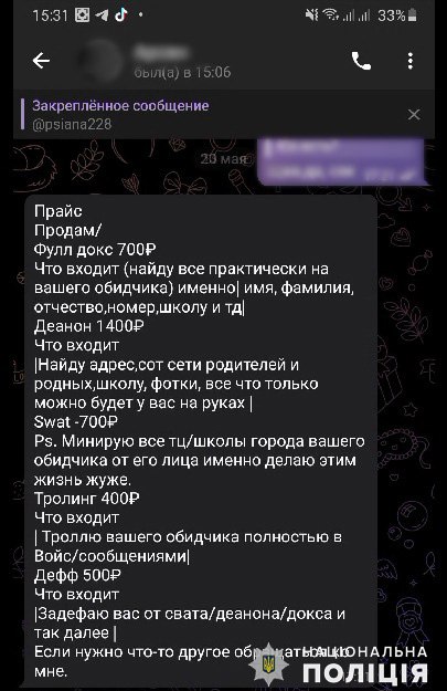 Кроме того, злоумышленник осуществлял доксинг за деньги. Киберполицейские установили, что несовершеннолетний предлагал в мессенджерах найти информацию о лице и его родных из открытых источников, а также осуществить кибербуллинг жертвы. В дальнейшем подросток присылал клиентам отчеты о проделанной «работе», — сообщает Департамент киберполиции Национальной полиции Украины.