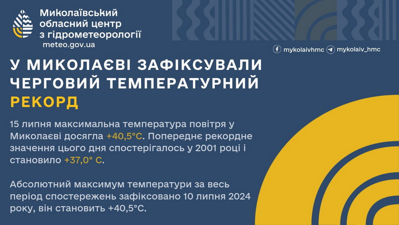 Николаевский центр по гидрометеорологии также сообщил, что это не первый температурный рекорд в этом месяце — 10 июля был побит рекорд абсолютного максимума температуры воздуха за весь период наблюдений. Отныне максимальное значение температуры в Николаеве составляет +40,5°С, что было зафиксировано как 10, так и 15 июля 2024 года.