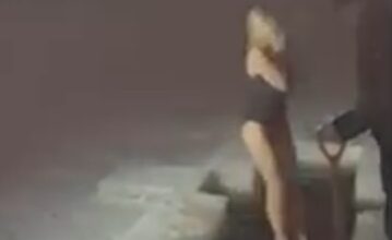 На кадрах женщина в купальнике, только что вышедшая из бани, крестится и смело прыгает в полынью, после чего за долю секунды исчезает…